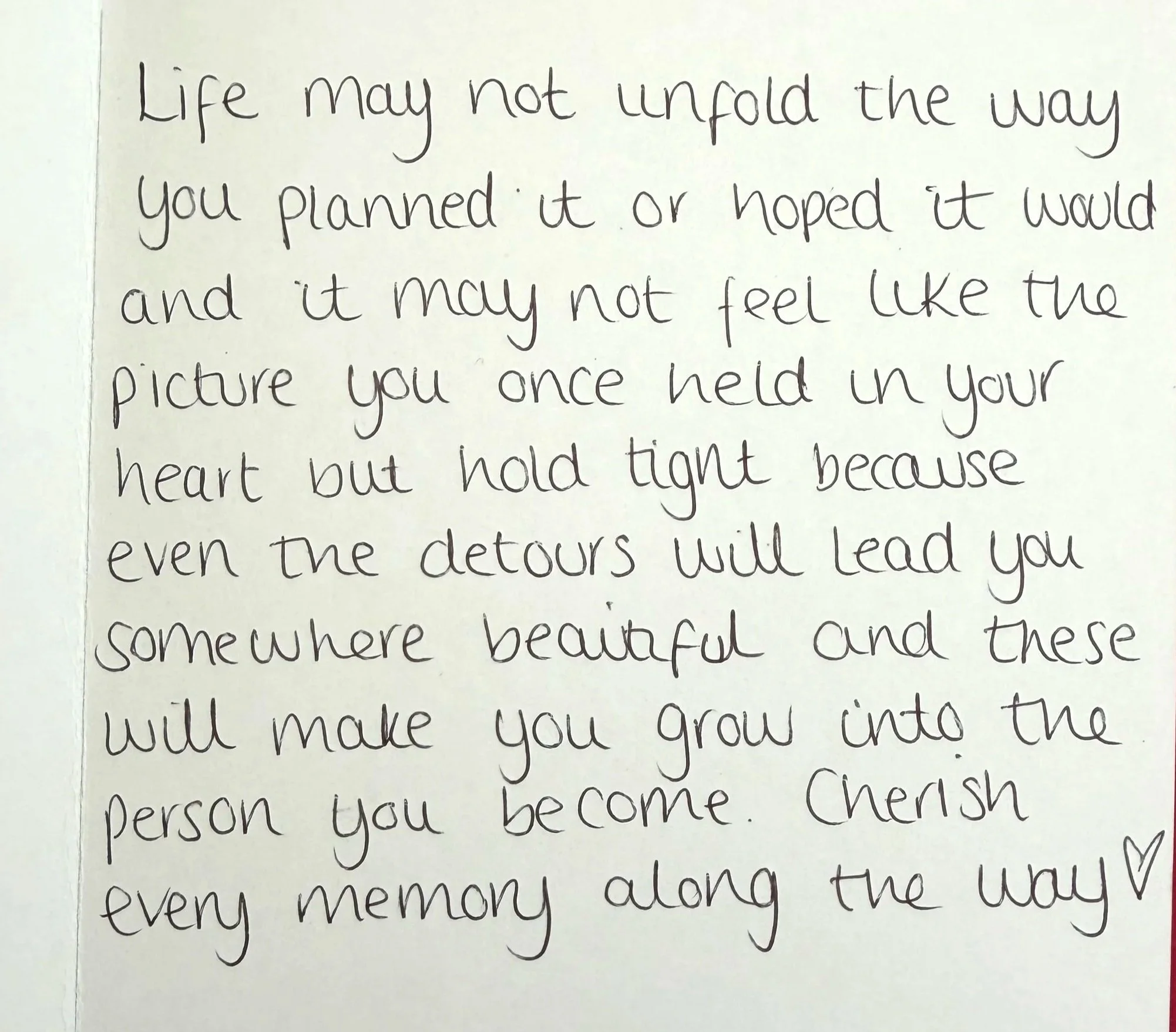 Life may not unfold the way you planned it or hoped it would and it may not feel like the picture you once held in your heart but hold tight because even the detours will lead you somewhere beautiful and these will make you grow into the person you become. Cherish every memory along the way.